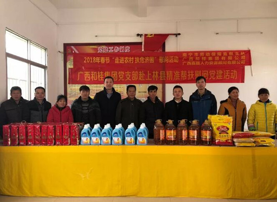 寒冬送温暖,爱心满和桂值2018年新春佳节即将到来之际,为了表达对困难户、低保户和贫困党员的关爱和帮助,让他们度过一个快乐、平安、祥和的新春佳节。2018年2月2日,广西和桂集团党支部书记周云同志、人力行政总监梁伟同志等一行四人代表集团公司,会同我们的联建单位-南宁市劳动保障监察支队党支部书记赵斌同志带领的支部成员,一起到南宁市上林县白圩镇龙楼村开展“寒冬送温暖,爱心满和桂”的精准扶贫,慰问贫困户家庭的党建活动。慰问团一行深入农村,走进贫困家庭,为他们送去了慰问金和油、米、保适洁洗衣液、节日礼包等生活用品,送去了集团公司的关怀和温暖。